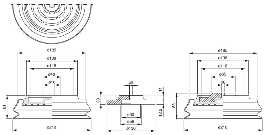 Sugkopp i nitril flat med tätningsbälg - 210 mm. Centrumhål 8 mm.