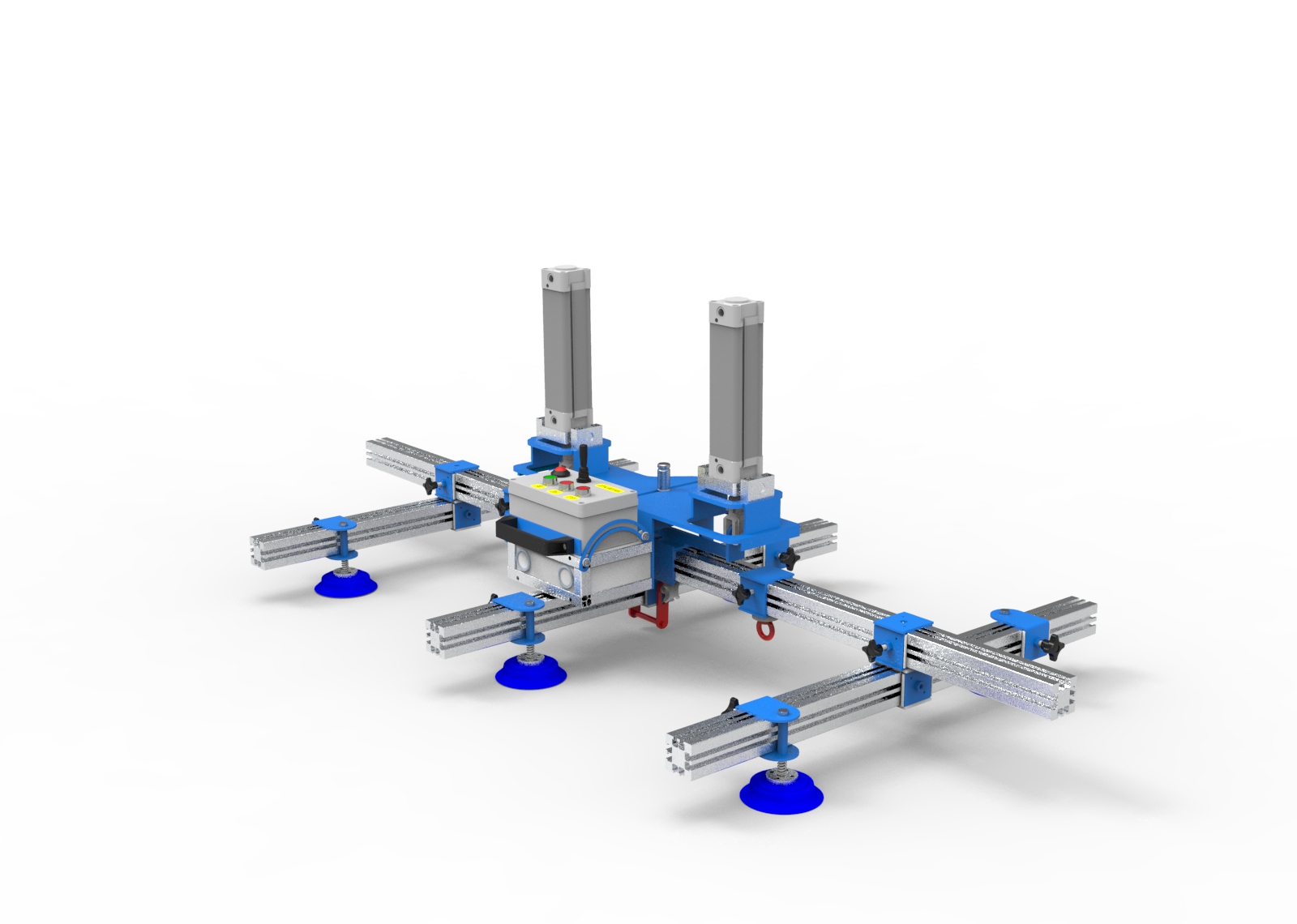 Vakuumlyft med 90 gradig tiltfunktion. Sex stycken sugkoppar om 141 mm. Pneumatisk tiltfunktion med spak och låsventiler. Justerbara sugkoppar. Justerbart läge på manöverlåda. Levereras CE-märkt med full dokumentation.